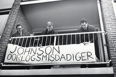 | Tijdens de protesten in de jaren zestig werd de kreet 'Johnson moordenaar' snel populair. Vier Utrechtse studenten werden in 1967 tot aan de Hoge Raad aan toe vanwege de leuze veroordeeld, omdat ze daarmee een bevriend staatshoofd zouden hebben beledigd. Het viertal kreeg ieder honderd gulden boete. De Groninger filosofieprofessor Bernard Delfgauw bedacht als correct alternatief 'Johnson oorlogsmisdadiger volgens de rechtsnormen van Neurenberg en Tokio'. Justitie trad niet op. |